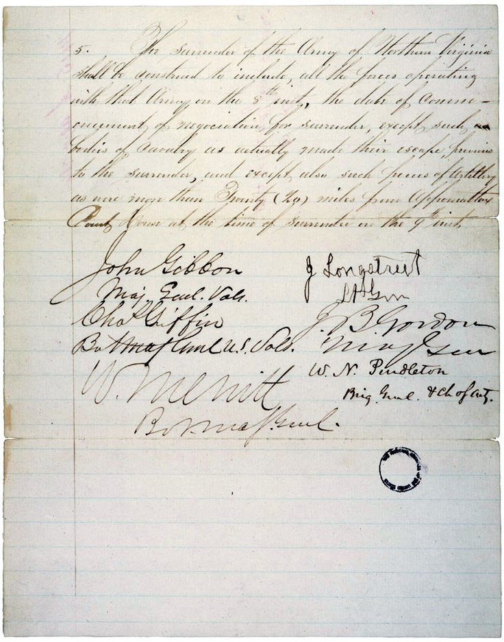 John Gibbon was a Confederate was a major general for the Confederacy. J. Longstreet was James Longstreet, a Confederate lieutenant general. W.N. Pendleton was William Nelson Pendleton, who was chief of artillery for the Army of Northern Virginia. Apparently this is a document that was signed by the Confederate officers, agreeing to the terms of the surrender. I don’t see Lee’s signature on it either, wonder if this was just the “lower” officers? Fascinating stuff!