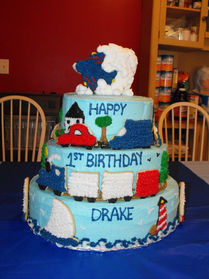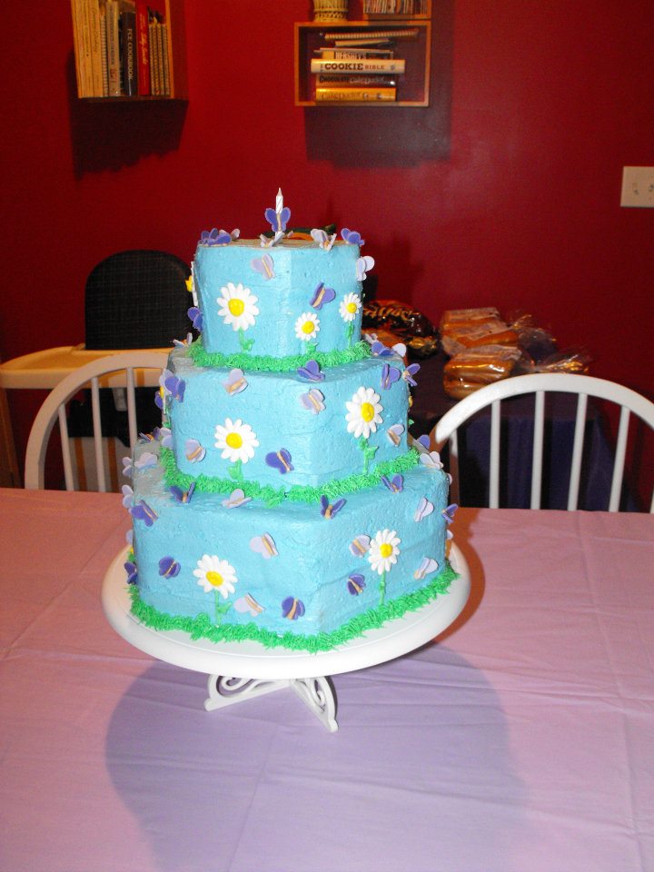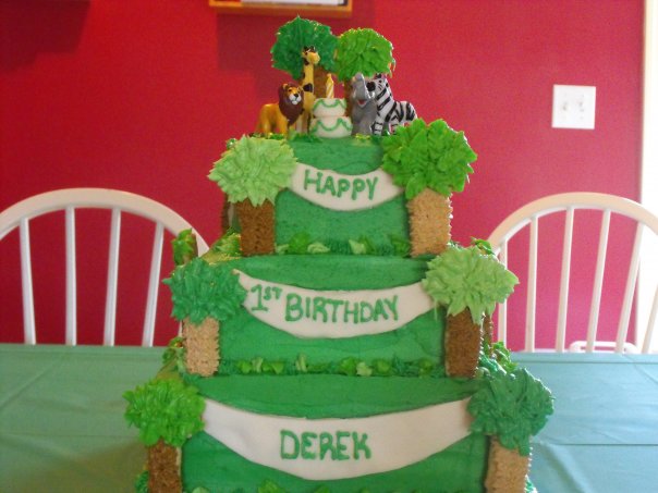 Four kids means four fun, birthday cake challenges each year. 🙂 I enjoy designing and decorating the kids’ birthday cakes. These four pics are my childrens’ first birthday cakes. 1) Sports 2) Jungle Party 3) Trains, Cars, Boats, and Planes 4) Butterflies and Daisies