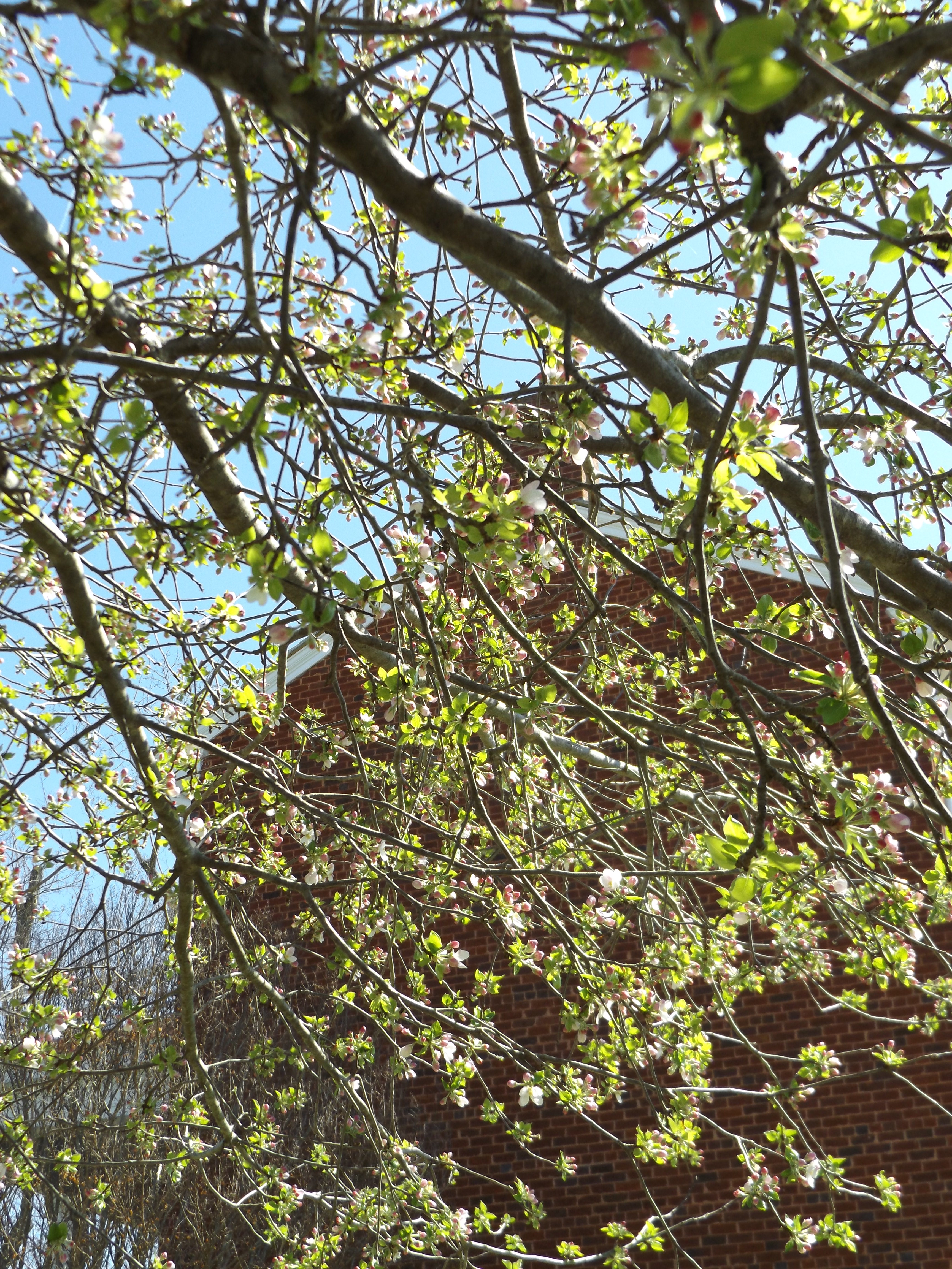 You can’t see much of the house here, but I love the view of the brick home from behind the pink-blooming tree.