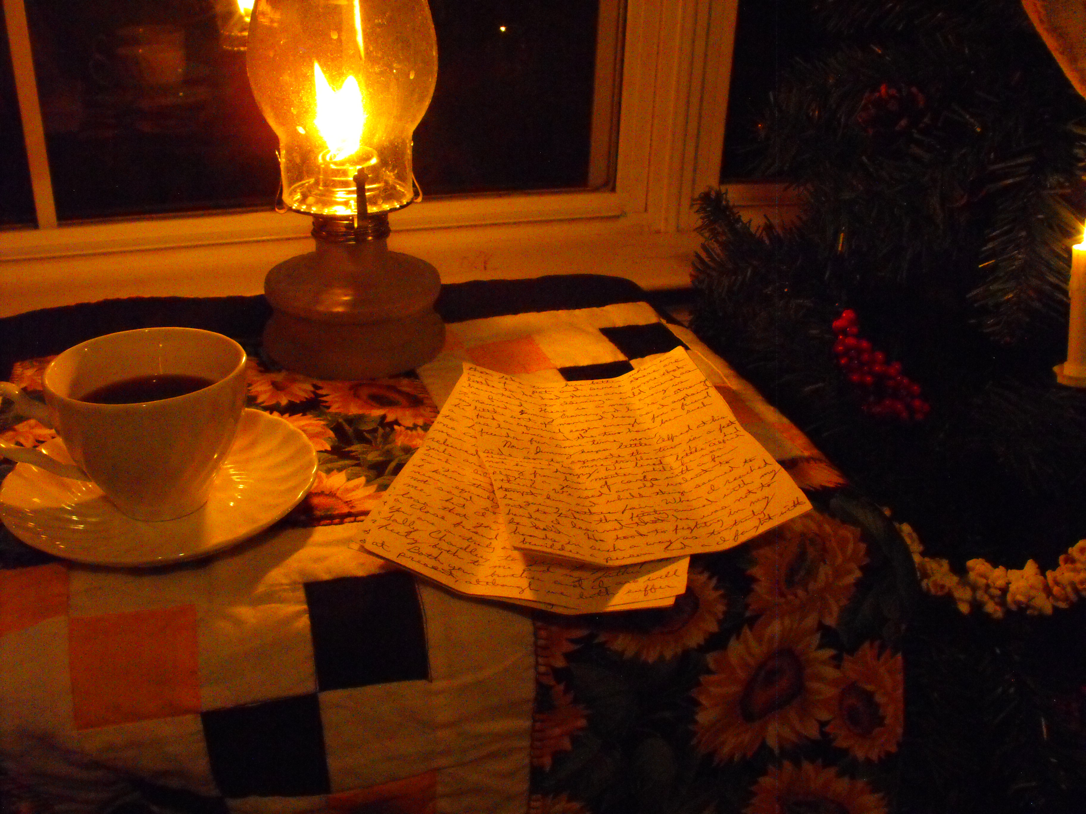 2047_1229winter20130113 I took advantage of the moment and finished off the scene, by pulling together some props. I pulled out a small table, a couple homemade blankets, lantern, the letters used on my book covers, rocking chair, and a cup of coffee.